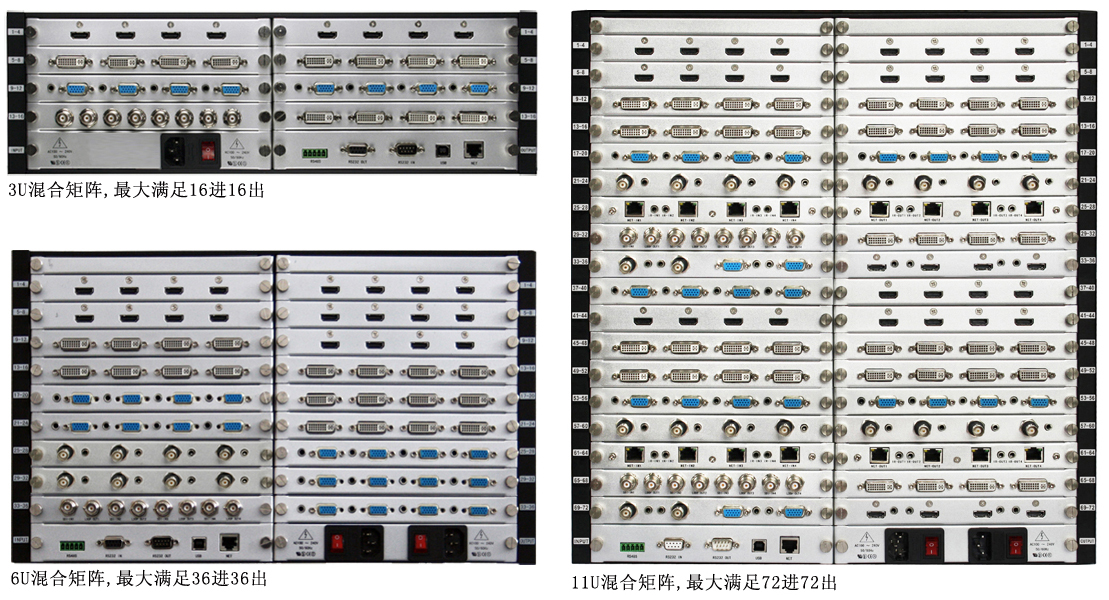 * 36×36混合矩陣,最大支持:9塊輸入板塊(每張板塊4路接口),9塊輸出板卡(每張板塊4路接口)
